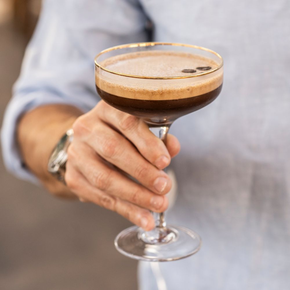 Un elegante y clásico cóctel elaborado con un shot de café de grano, vodka y un toque de cacao. La historia cuenta que en el año 1984 una futura supermodelo (se piensa que fue Naomi Campbell) se acercó furtivamente al bar y le pidió al bartender, Drick Bradsel, un cóctel que la despetara. Y voilá ¡nace el Espresso Martini!
